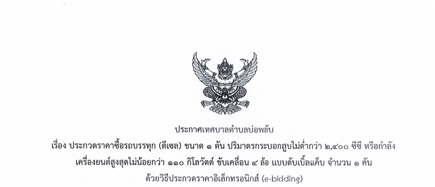 ประกาศเทศบาลตำบลบ่อพลับ เรื่อง การประกวดราคาซื้อรถบรรทุก (ดีเซล) ขนาด 1 ตัน ปริมาตรกระบอกสูบไม่ต่ำกว่า 2,400 ซีซี หรือกำลังเครื่องยนต์สูงสุดไม่น้อยกว่า 110 กิโลวัตต์ ขับเคลื่อน 4 ล้อ แบบดับเบิ้ลแค็บ จำนวน 1 คัน ด้วยวิธีประกวดราคาอิเล็กทรอนิกส์ (e-bidding)