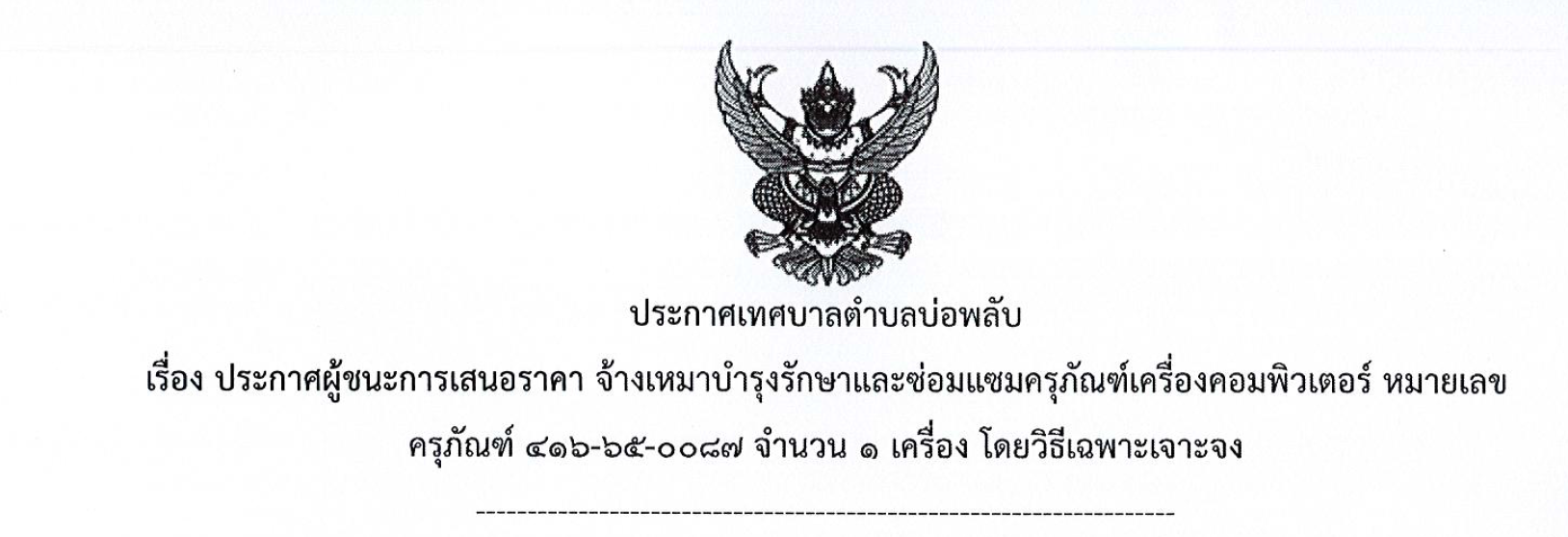 ประกาศผู้ชนะการเสนอราคา จ้างเหมาบำรุงรักษาและซ่อมแซมเครื่องคอมพิวเตอร์ หมายเลขครุภัณฑ์ ๔๑๖-๖๕-๐๐๘๗ จำนวน ๑ เครื่อง โดยวิธีเฉพาะเจาะจง