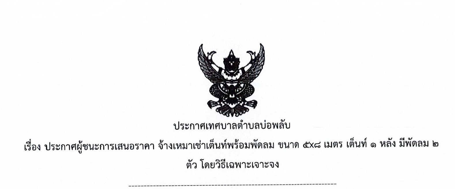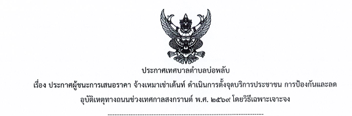 ประกาศผู้ชนะการเสนอราคา จ้างเหมาเช่าเต้นท์ ดำเนินการตั้งจุดบริการประชาชน การป้องกันและลดอุบัติเหตุทางถนนช่วงเทศกาลสงกรานต์ ปี พ.ศ. 2569 โดยวิธีเฉพาะเจาะจง