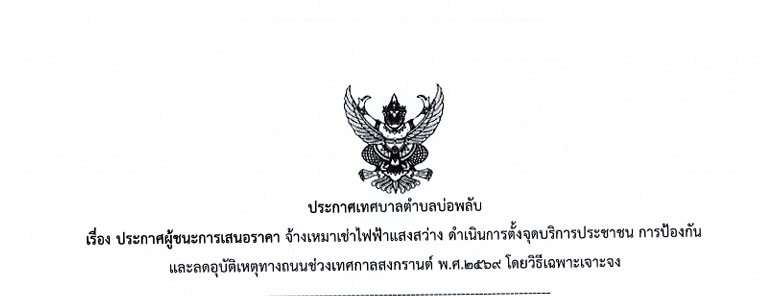 ประกาศผู้ชนะการเสนอราคาจ้างเหมาไฟฟ้าแสงสว่าง ดำเนิการตั้งจุดบริการประชาชน การป้องกันและลดอุบัติเหตุทางถนนช่วงเทศกาลสงกรานต์ พ.ศ. 2569 โดยวิธีเฉพาะเจาะจง