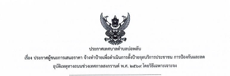 ประกาศผู้ชนะการเสนอราคา จ้างเหมาทำป้ายเพื่อดำเนินการตั้งป้ายจุดบริการประชาชน การป้องกันและลดอุบัติเหตุทางถนนช่วงเทศกาลสงกรานต์ พ.ศ. 2569 โดยวิธีเฉพาะเจาะจง