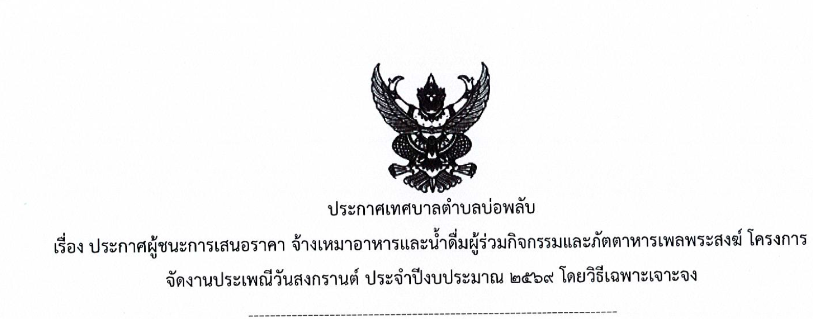 ประกาศผู้ชนะการเสนอราคา จ้างเหมาอาหารและน้ำดื่มผู้ร่วมกิจกรรม และภัตตาหารเพลพระสงฆ์ โครงการจัดงานประเพณีวันสงกรานต์ ประจำปีงบประมาณ ๒๕๖๙ โดยวิธีเฉพาะเจาะจง