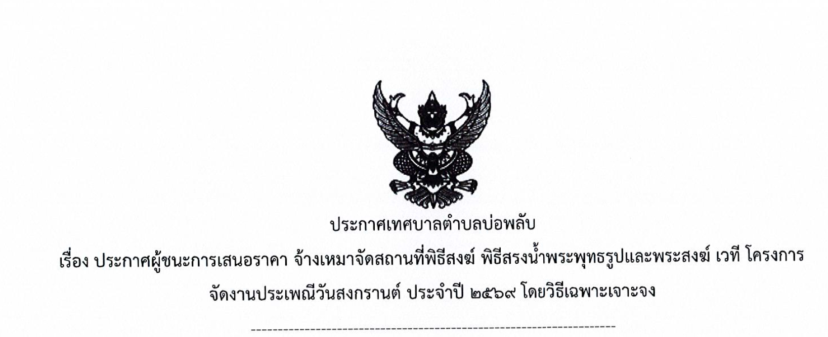 ประกาศผู้ชนะการเสนอราคา จ้างเหมาจัดสถานที่พิธีสงฆ์ พิธีสรงน้ำพระพุทธรูปและพระสงฆ์ เวที โครงการจัดงานประเพณีวันสงกรานต์ ประจำปี ๒๕๖๙ โดยวิธีเฉพาะเจาะจง