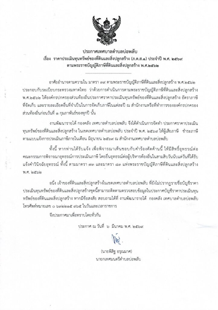 ประกาศ แบบบัญชีกำหนดราคาประเมินทุนทรัพย์ของที่ดินและสิ่งปลูกสร้าง ประจำปี พ.ศ.2569