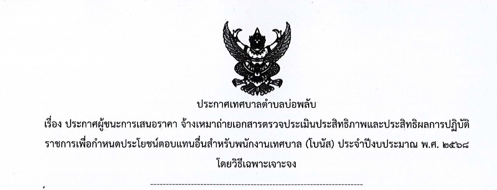 ประกาศผู้ชนะการเสนอราคา จ้างเหมาถ่ายเอกสารตรวจประเมินประสิทธิภาพและประสิทธิผลการปฏิบัติราชการเพื่อกำหนดประโยชน์ตอบแทนอื่นสำหรับพนักงานเทศบาล(โบนัส) ประจำปีงบประมาณ พ.ศ. 2568 โดยวิธีเฉพาะเจาะจง