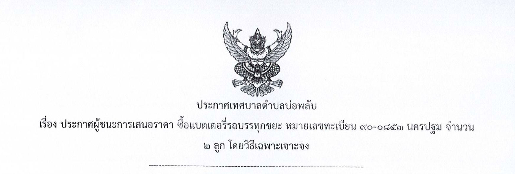 ประกาศเทศบาลตำบลบ่อพลับ เรื่อง การประกวดราคาซื้อรถบรรทุก (ดีเซล) ขนาด 1 ตัน ปริมาตรกระบอกสูบไม่ต่ำกว่า 2,400 ซีซี หรือกำลังเครื่องยนต์สูงสุดไม่น้อยกว่า 110 กิโลวัตต์ ขับเคลื่อน 4 ล้อ แบบดับเบิ้ลแค็บ จำนวน 1 คัน ด้วยวิธีประกวดราคาอิเล็กทรอนิกส์ (e-bidding)
