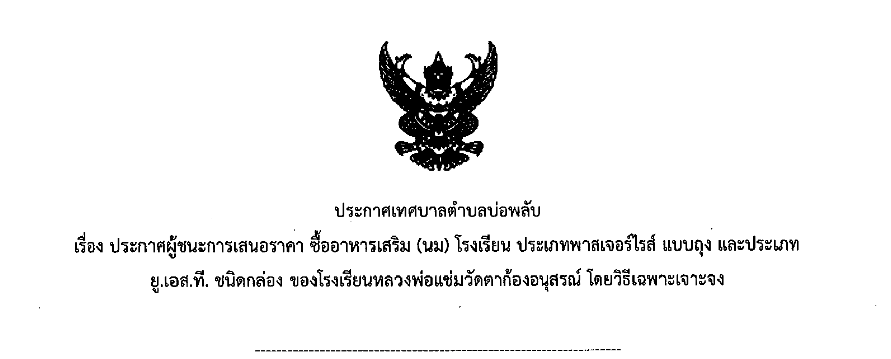 ประกาศผู้ชนะการเสนอราคา ซื้ออาหารเสริม (นม) โรงเรียน ประเภทพาสเจอร์ไรส์ แบบถุง และประเภท ยู.เอส.ที. ชนิดกล่อง ของโรงเรียนหลวงพ่อแช่มวัดตาก้องอนุสรณ์ โดยวิธีเฉพาะเจาะจง