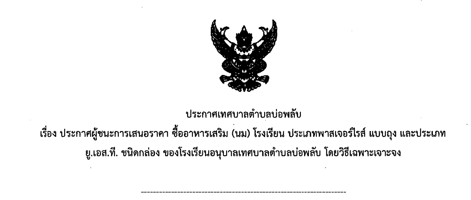 ประกาศผู้ชนะการเสนอราคา ซื้ออาหารเสริม (นม) โรงเรียน ประเภทพาสเจอร์ไรส์ แบบถุง และประเภท ยู.เอส.ที. ชนิดกล่อง ของโรงเรียนอนุบาลเทศบาลตำบลบ่อพลับ โดยวิธีเฉพาะเจาะจง