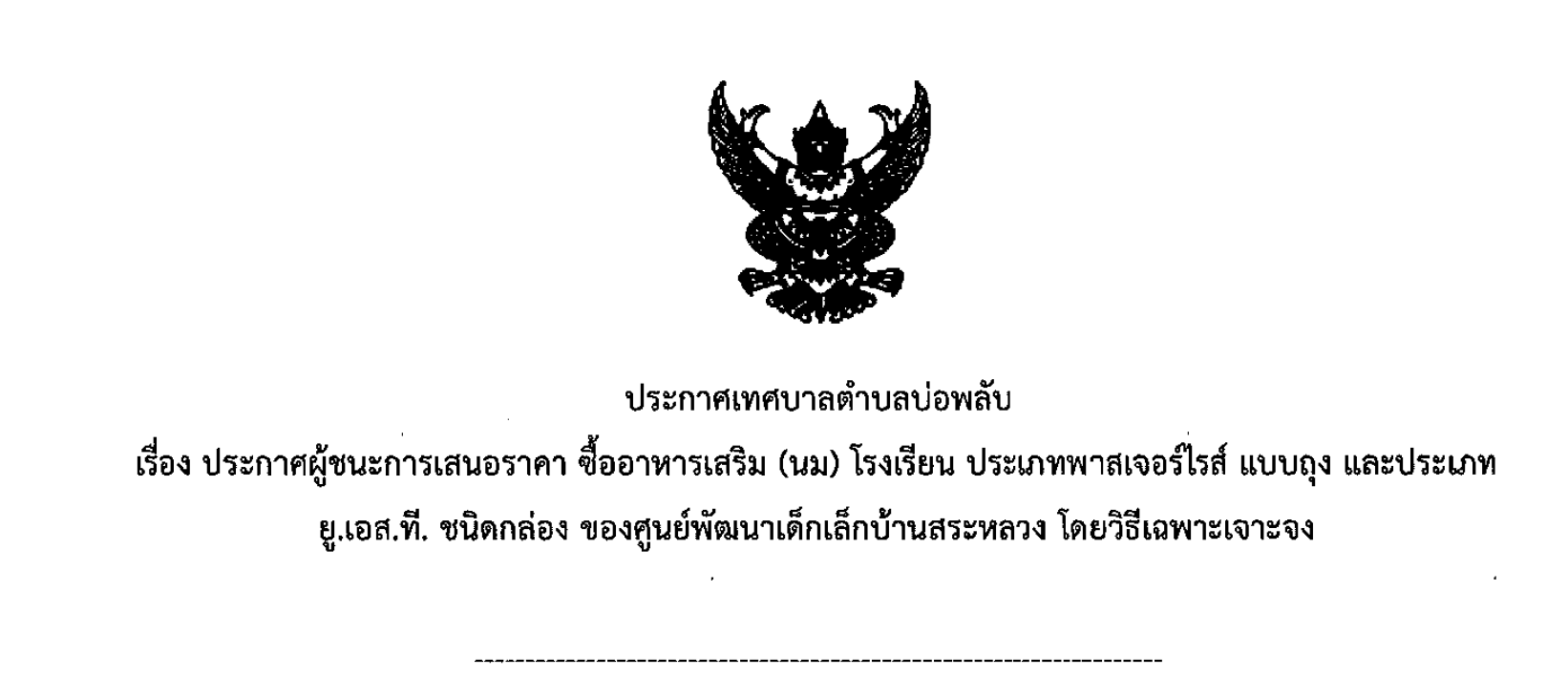 ประกาศผู้ชนะการเสนอราคา ซื้ออาหารเสริม (นม) โรงเรียน ประเภทพาสเจอร์ไรส์ แบบถุง และประเภท ยู.เอส.ที. ชนิดกล่อง ของศูนย์พัฒนาเด็กเล็กบ้านสระหลวง โดยวิธีเฉพาะเจาะจง