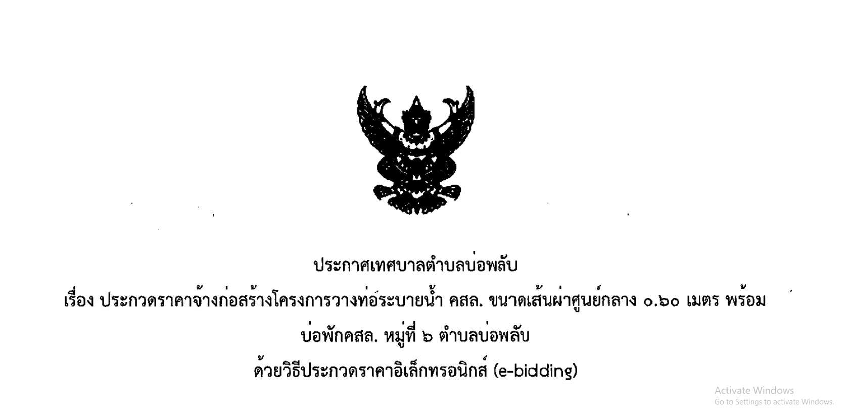 ประกาศเทศบาลตำบลบ่อพลับเรื่องการประกวดราคาจ้างก่อสร้างโครงการวางท่อระบายน้ำ คสล. ขนาดเส้นผ่าศูนย์กลาง ๐.๖๐ เมตร พร้อมบ่อพักคสล. หมู่ที่ ๖ ตำบลบ่อพลับ ด้วยวิธีประกวดราคาอ้เล็กทรอนิกส์ (e-bidding)