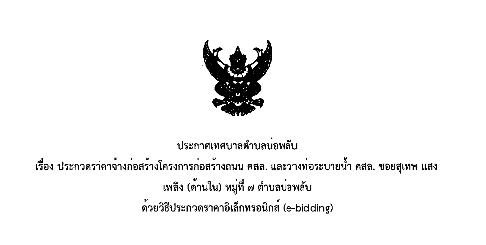 ประกาศการประกวดราคาจ้างก่อสร้างโครงการก่อสร้างถนน คสล. และวางท่อระบายน้ำ คสล. ซอยสุเทพ แสงเพลิง (ด้านใน) หมู่ที่ 7 ตำบลบ่อพลับ ด้วยวิธีประกวดราคาอิเล็กทรอนิกส์ (e-bidding)