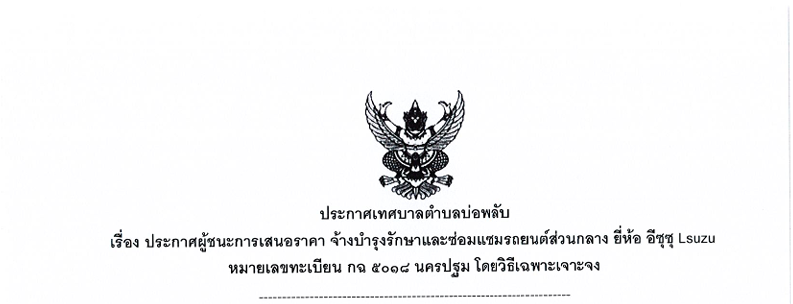 ประกาศผู้ชนะการเสนอราคา จ้างเหมาบริการเครื่องจักรกล รถขุดตีนตะขาบพร้อมหัวสกัดคอนกรีต เพื่อปรับปรุงท่อเมนระบบจำหน่ายน้ำประปาขนาดเส้นผ่าศูนย์กลาง 3 นิ้ว ระยะทาง45เมตร บริเวณ (หน้าบ้าน ผ.ญ.สุทธิพงค์ ประคองสกุลดี) หมู่ที่ 7 ต.บ่อพลับ
