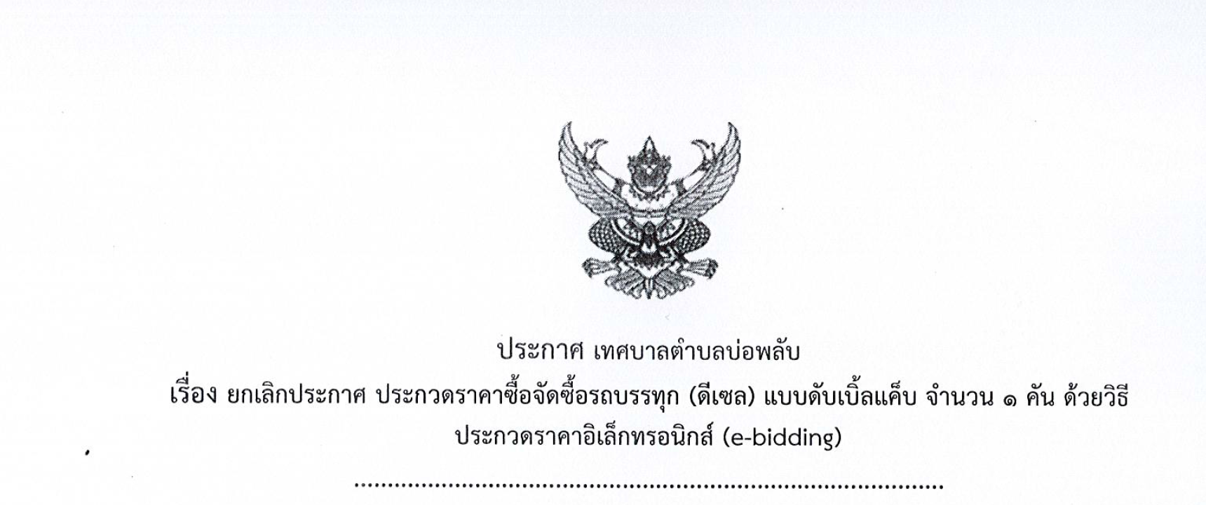 ประกาศเทศบาลตำบลบ่อพลับ เรื่องยกเลิกการประกาศประกวดราคาจัดซื้อรถบรรทุก (ดีเซล) แบบดับเบิ้ลแค็บ จำนวน ๑ คัน ด้วยวิธีประกวดราคาอิเล็กทรอนิกส์ (e-bidding)