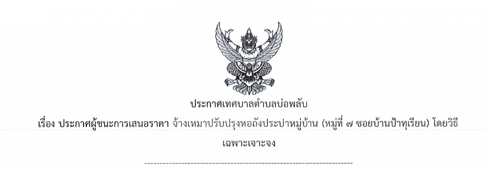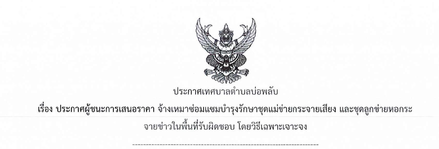 ประกาศผู้ชนะการเสนอราคา จ้างเหมาซ่อมแซมบำรุงรักษาชุดแม่ข่ายกระจายเสียง และชุดลูกข่ายหอกระจายข่าวในพื้นที่รับผิดชอบ โดยวิธีเฉพาะเจาะจง