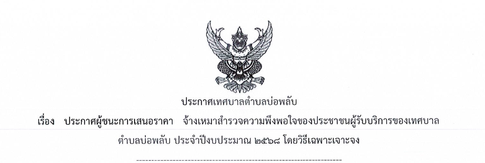 ประกาศผู้ชนะการเสนอราคา จ้างเหมาสำรวจความพึงพอใจของประชาชนผู้รับบริการของเทศบาล ตำบลบ่อพลับ ประจำปีงบประมาณ 2568 โดยวิธีเฉพาะเจาะจง