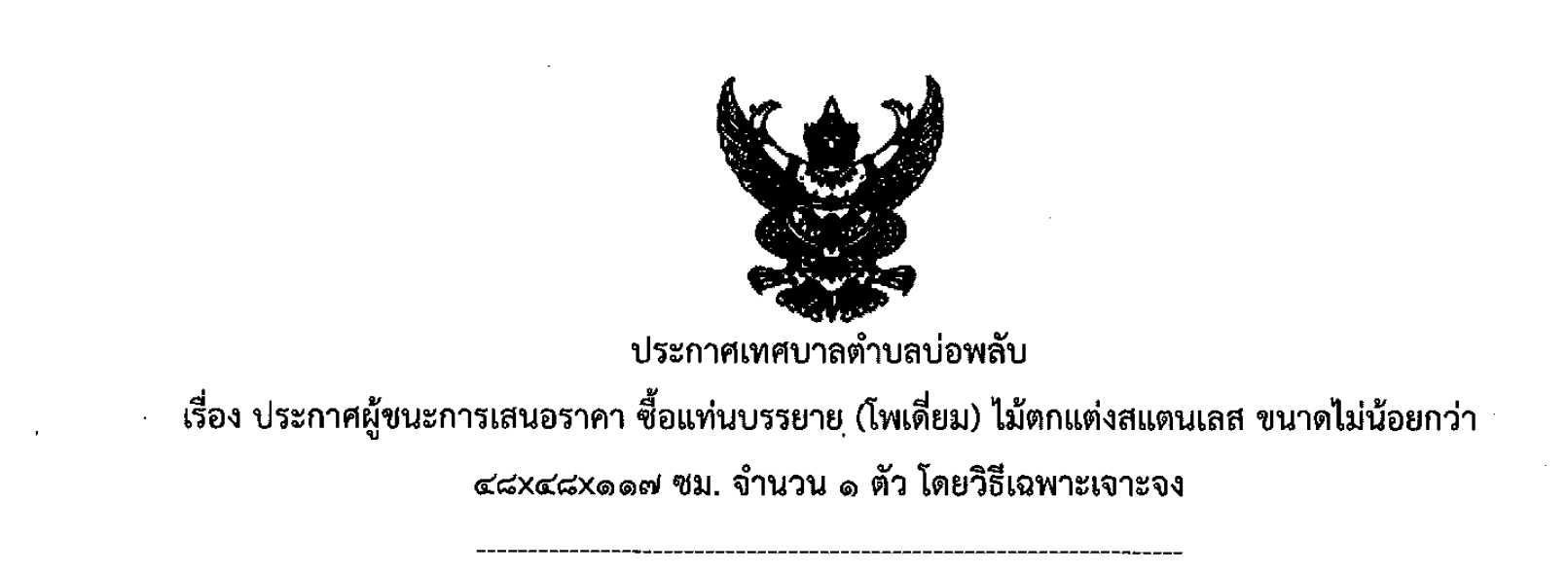 ประกาศผู้ชนะการเสนอราคา ซื้อแท่นบรรยาย (โพเดี่ยม) ไม้ตกแต่งสแตนเลส ขนาดไม่น้อยกว่า ๔๘x๔๘x๑๑๗ ซม. จำนวน ๑ ชุด โดยวิธีเฉพาะเจาะจง